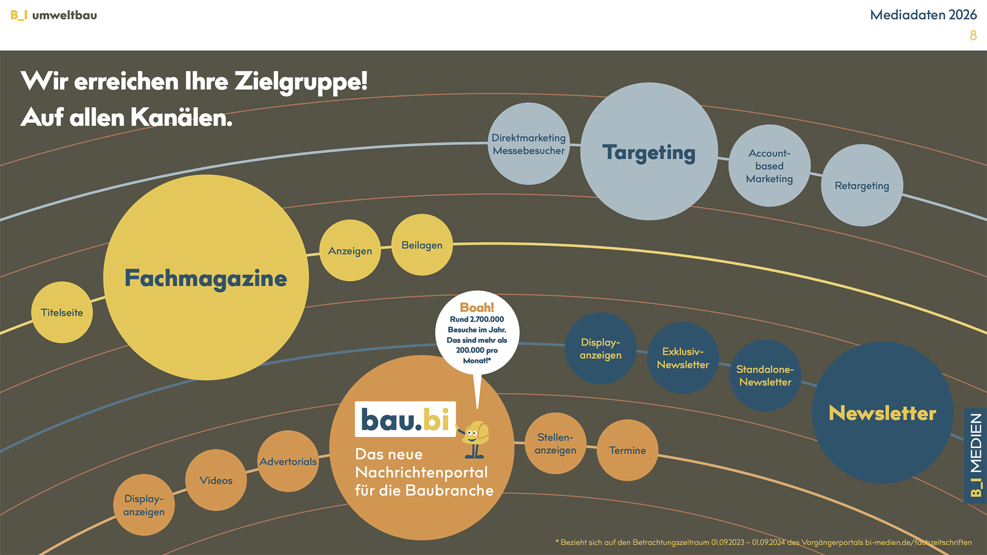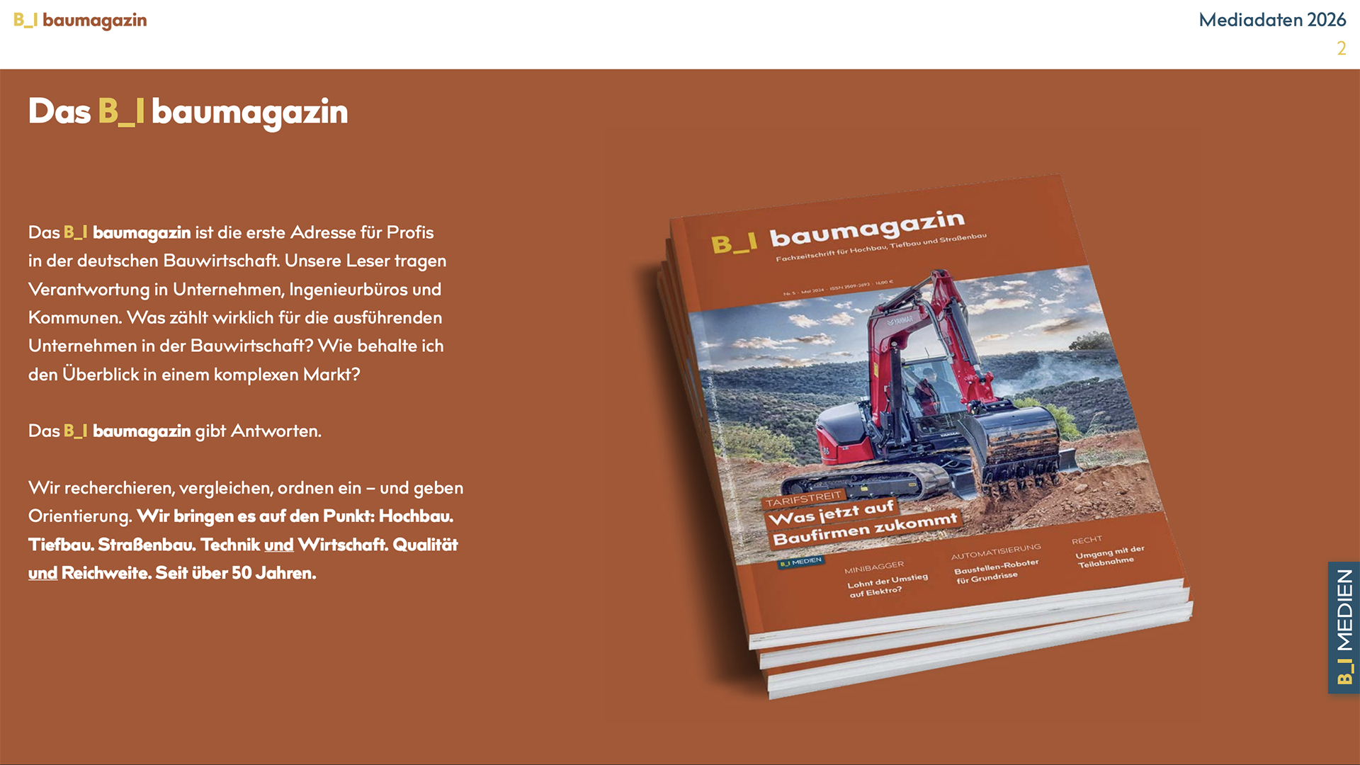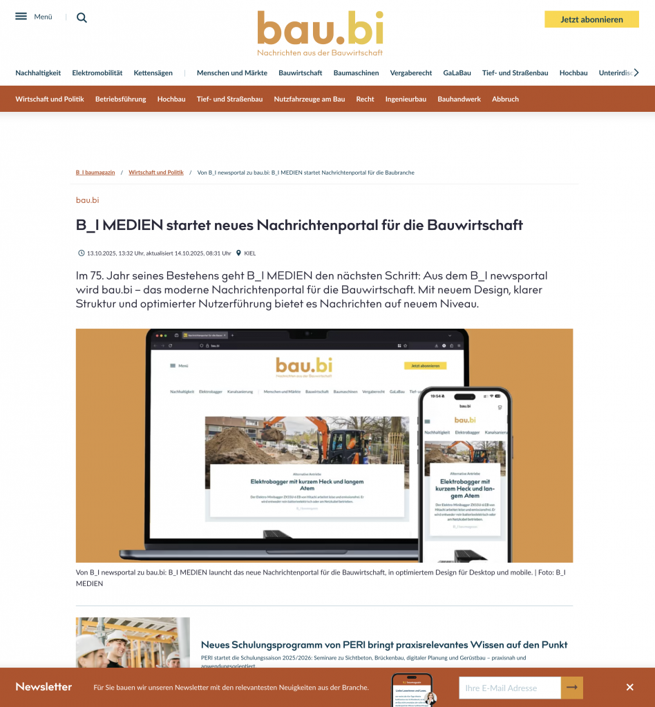 B_I Medien ist ja vor allem durch die Fachmagazine B_I baumagazin, B_I umweltbau und B_I galabau bekannt. Und durch die B_I ausschreibungsdienste, wo Unternehmen öffentliche Ausschreibung und Aufträge finden oder vergeben können. Das Nachrichtenportal existiert schon viele Jahre und hat im Schnitt weit über 2,5 Millionen Besucher*innen.