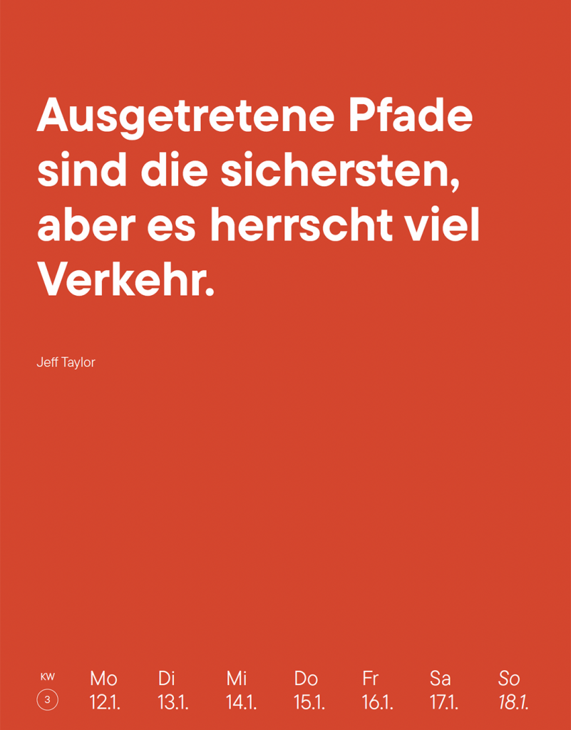 Ein Kalender für das Jahr 2026 mit Zitaten aus Kunst, Kultur und Gesellschaft. Ursprünglich ausgewählt für verschiedenste Projekte des Designstudios Aalhai. Hier erstmals frei und fröhlich zusammengestellt.Und damit mehr als exklusiv, denn die Auflage ist limitiert!