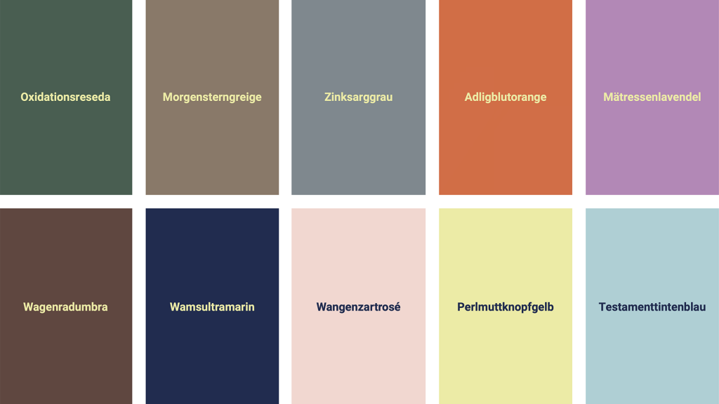 Bei den Farben spielen Gebäude, Räume, Gemälde und Mobiliar die zentrale Rolle:
