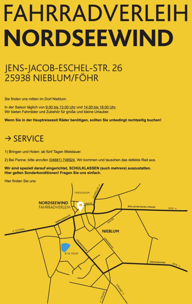 Der Nieblumer Fahrradverleih Nordseewind steht gut da mit seinem neuem Internetauftritt. Selbst bei 12 Windstärken wackelt da nichts.
