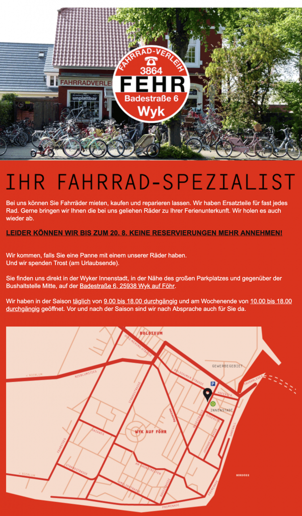 Nach Föhrrad und Nordseewind entsteht nun auch für die Fahrrad-Spezialisten Fehr ein neuer Internetauftritt. Neben dem Verleih von Fahrrädern wird die Vielfalt an Serviceleistungen – vom Verkauf hochwertiger Fahrräder bis zu Reparaturen aller Arten – im Fokus stehen.