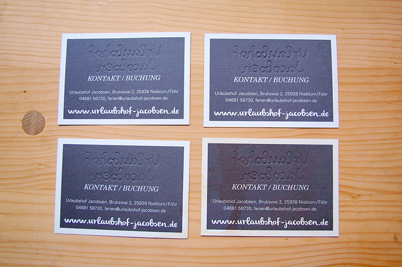 Die ersten Karten haben wir dann auch mit viel Gespür für diese Situation entwickelt. Gemeinsam mit Leander Gilbert haben wir die richtigen Papiere gefunden (u.a. Rives von Arjo Wiggins) und fein veredelt. Wobei man klar sagen muss, dass der richtig adäquate Feinschliff erst entstand als mir ein kompletter Pott Kaffee über die Druckmuster lief.
