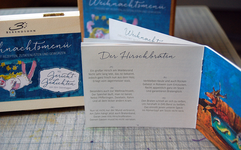 Anders kann man das nicht sagen. Für und mit der Hamburger Berendsohn AG habe ich gemeinsam mit Mario Crisolli und Susanne Kress, Jörn Sternhagen, Bruno Marc Antonio Giurini und Leander Gilbert echt köstliche Weihnachtsgeschenke entwickelt. Und da sind wirklich die besten Gedanken und Fähigkeiten aller Beteiligten zusammen gekommen!