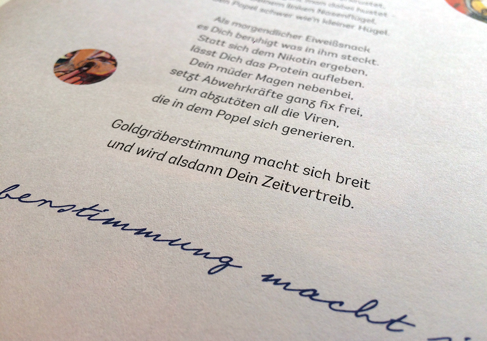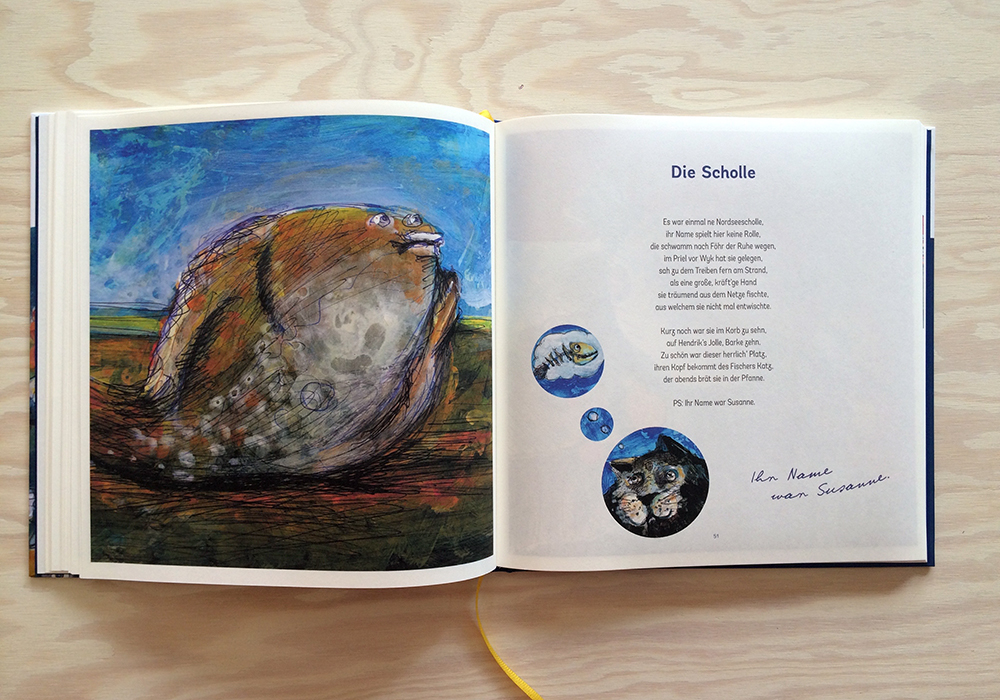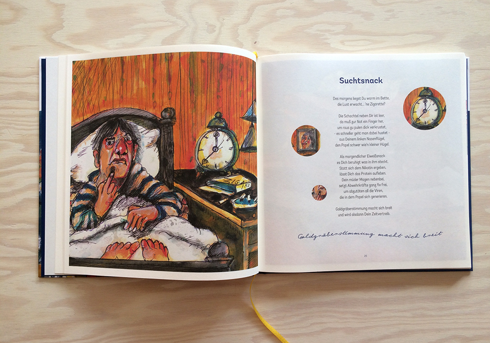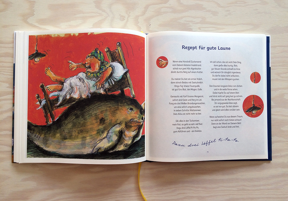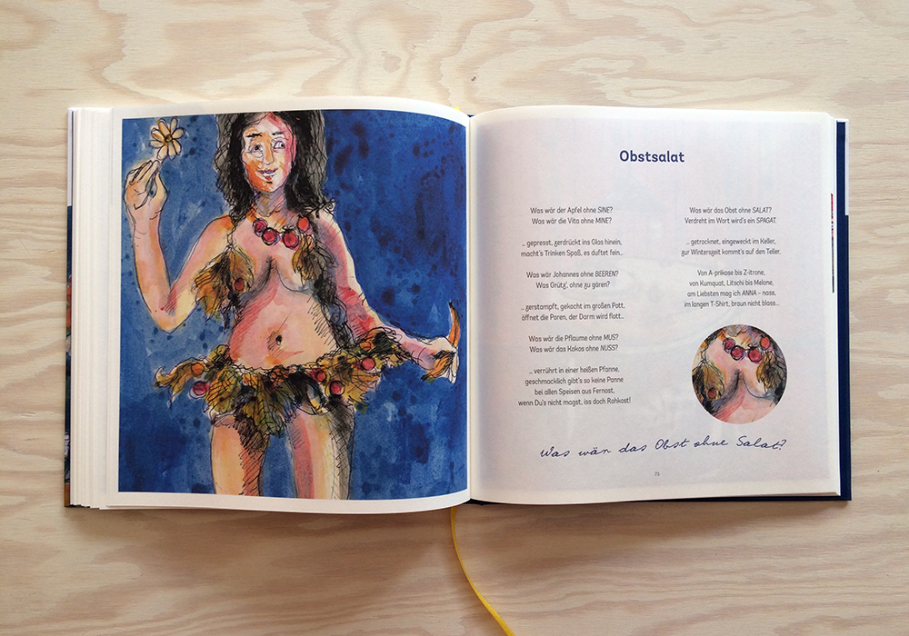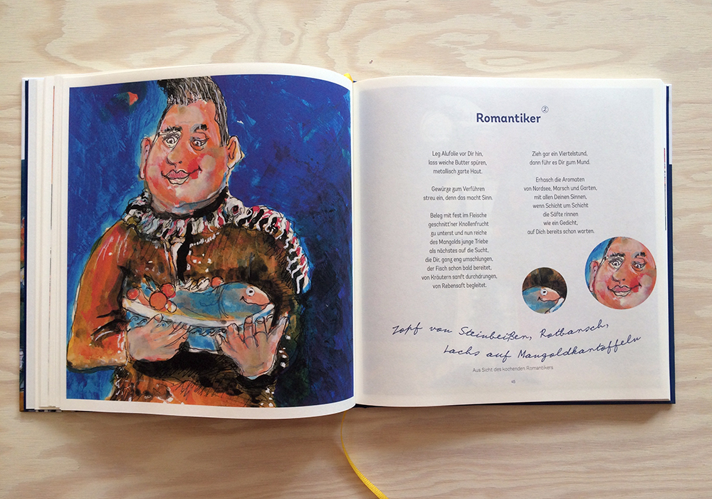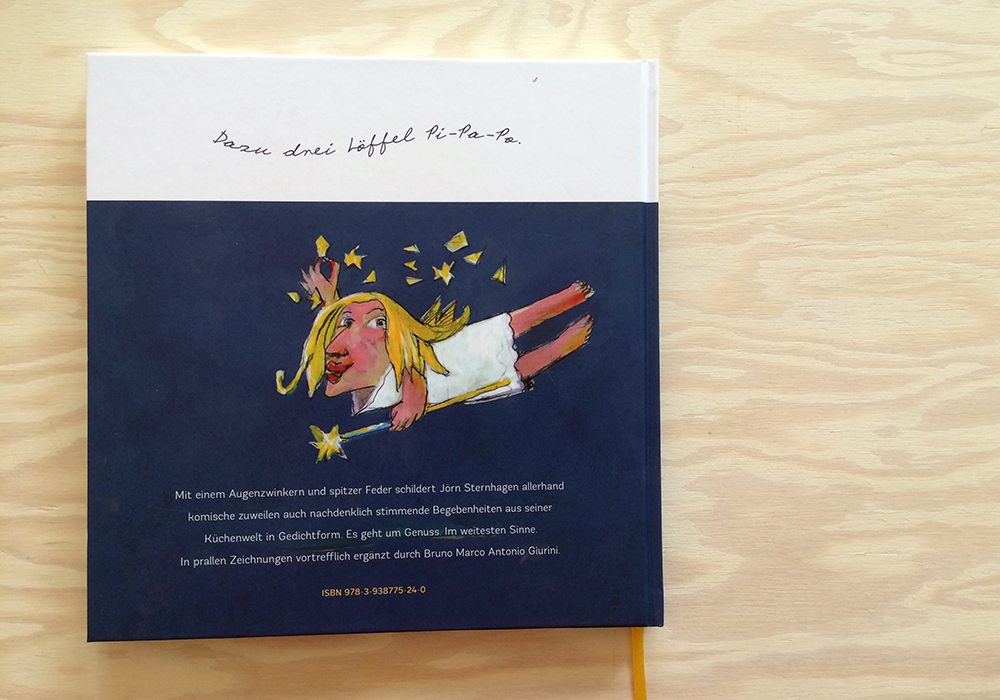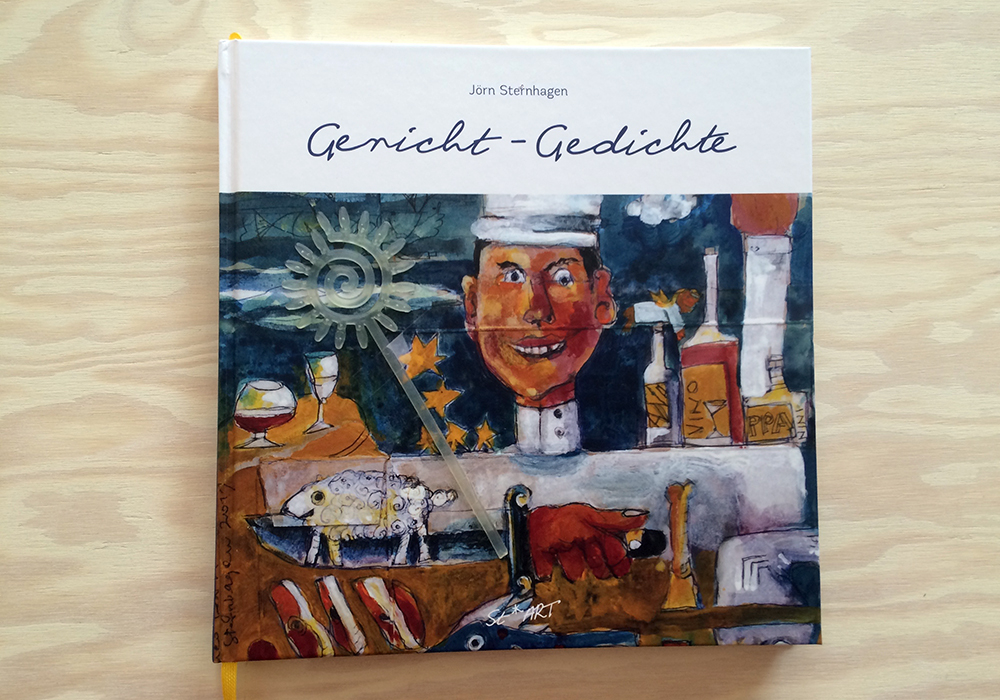 Für Jörn Sternhagen bin ich immer besonders gerne tätig. Mit ihm gibt es kreative Prozesse, vielfältige Themen und immer wieder neue Bekanntschaften. Das neueste Projekt ist die erste gebundene und erweiterte Ausgabe seiner berühmt-berüchtigten Gericht-Gedichte. Auf über 100 Seiten gibt es eine muntere Sammlung von bekloppt-genüsslichen und fein-poetischen Versen, wieder treffend illustriert von Bruno Marco Antonio Giurini.