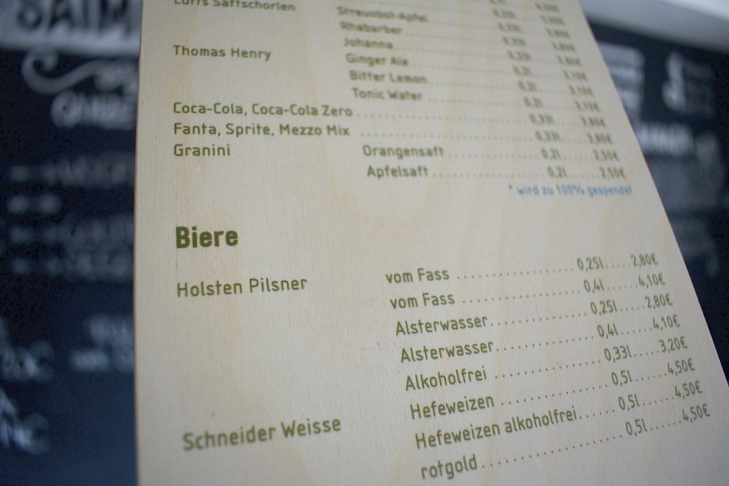 Während alle anderen Getränke ganz klassisch vom Brett zu bestellen sind. Hier ist dann auch erstmalig die neue Illustration von Tobi Dahmen zu sehen. Diese ist ja kurz nach der ersten Comic-Lesung Fahrradmod im Februar entstanden.