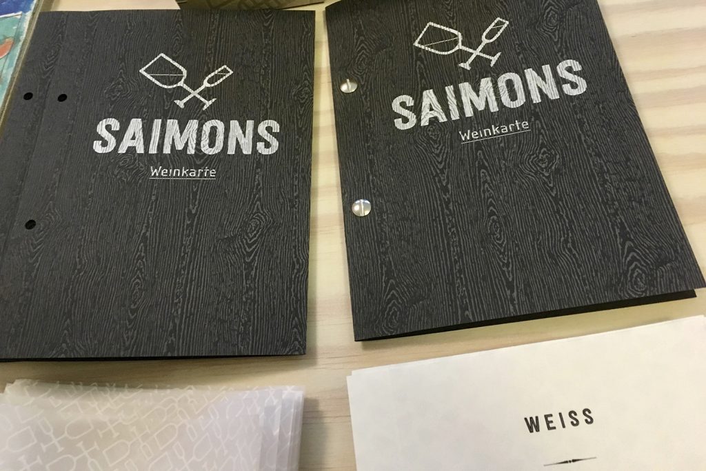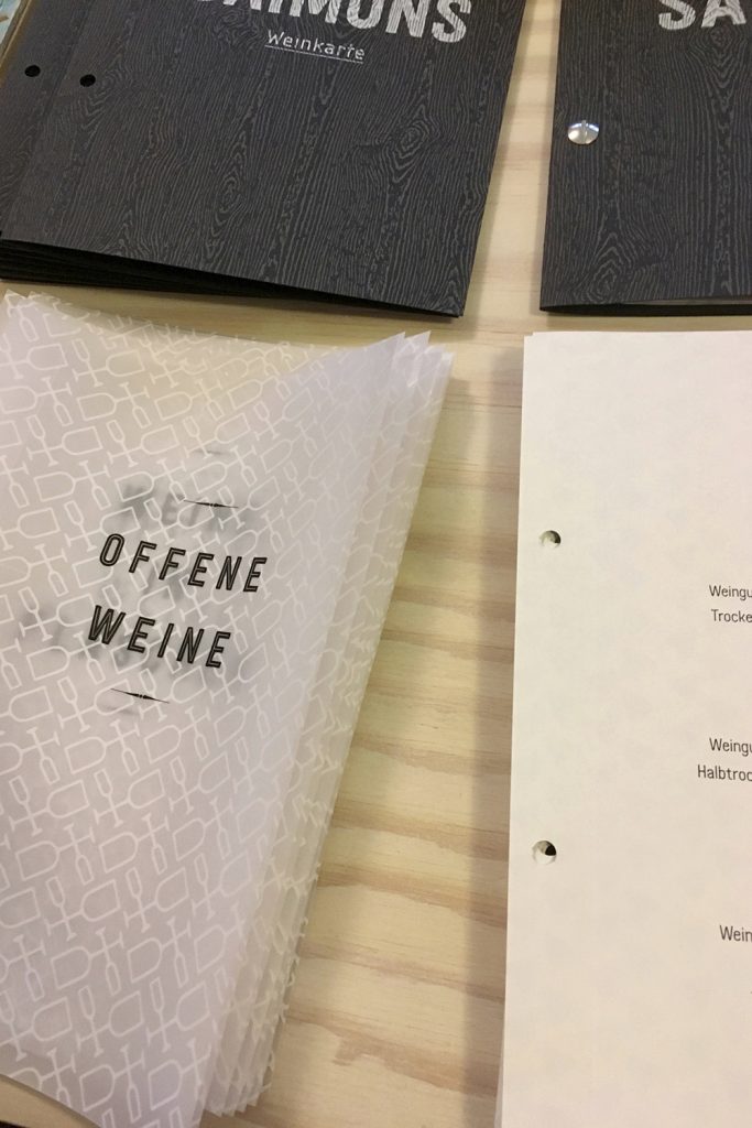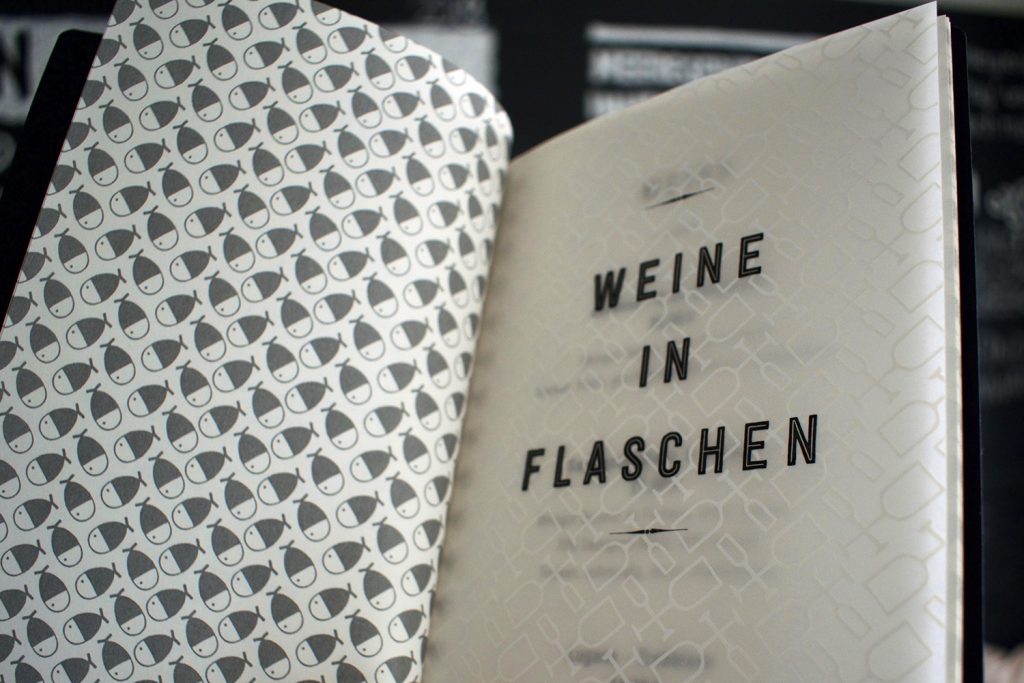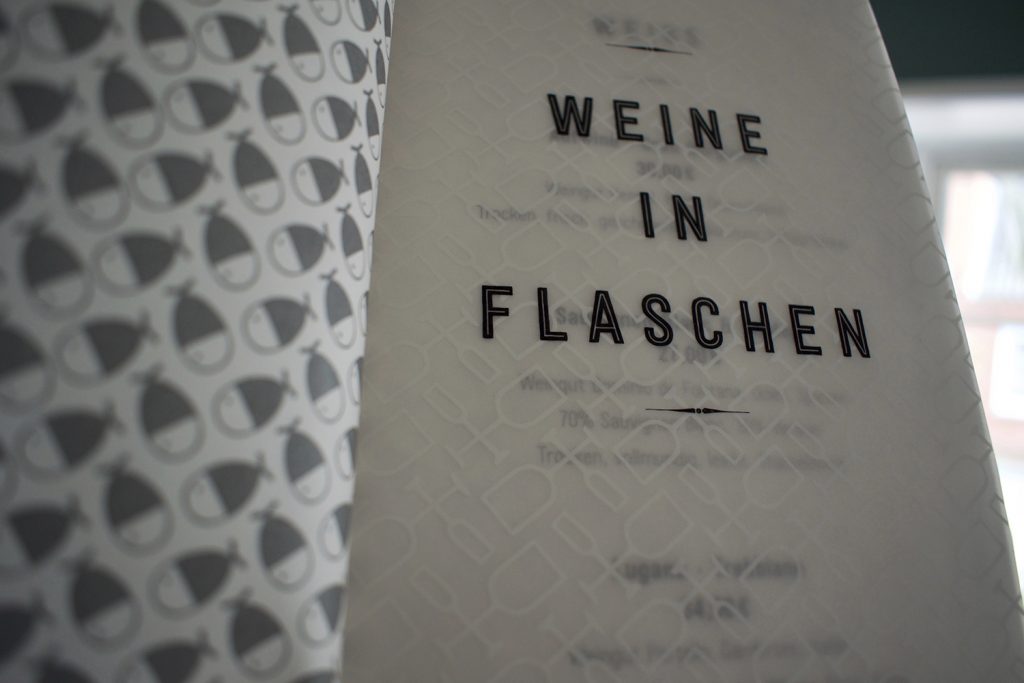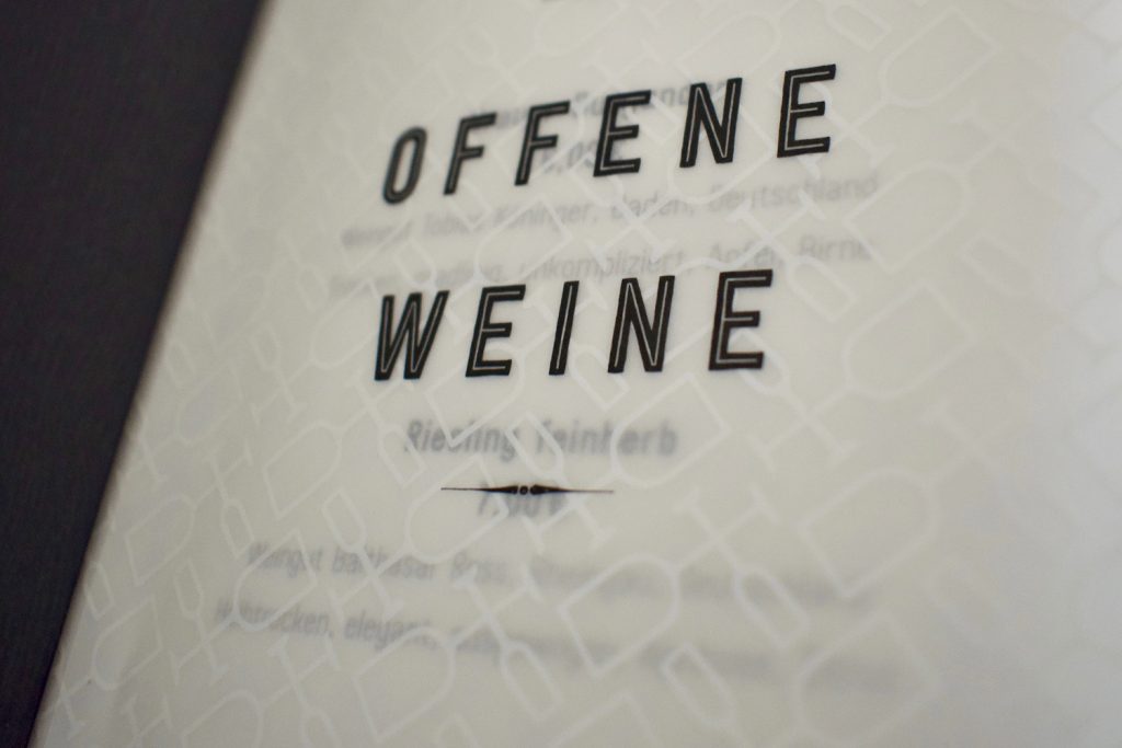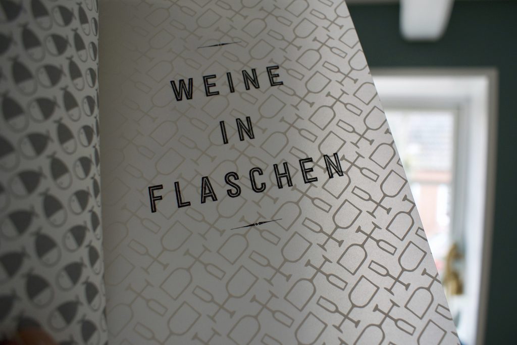 Erstmals gibt es eine eigene Weinkarte, die spielerisch-elegant daherkommt und an der einen oder anderen Stelle mit Transparenzen spielt. Für die ich ein neues Grafikelement aus dem Corporate Design abgeleitet habe. Und die natürlich von Hand konfektioniert wird.
